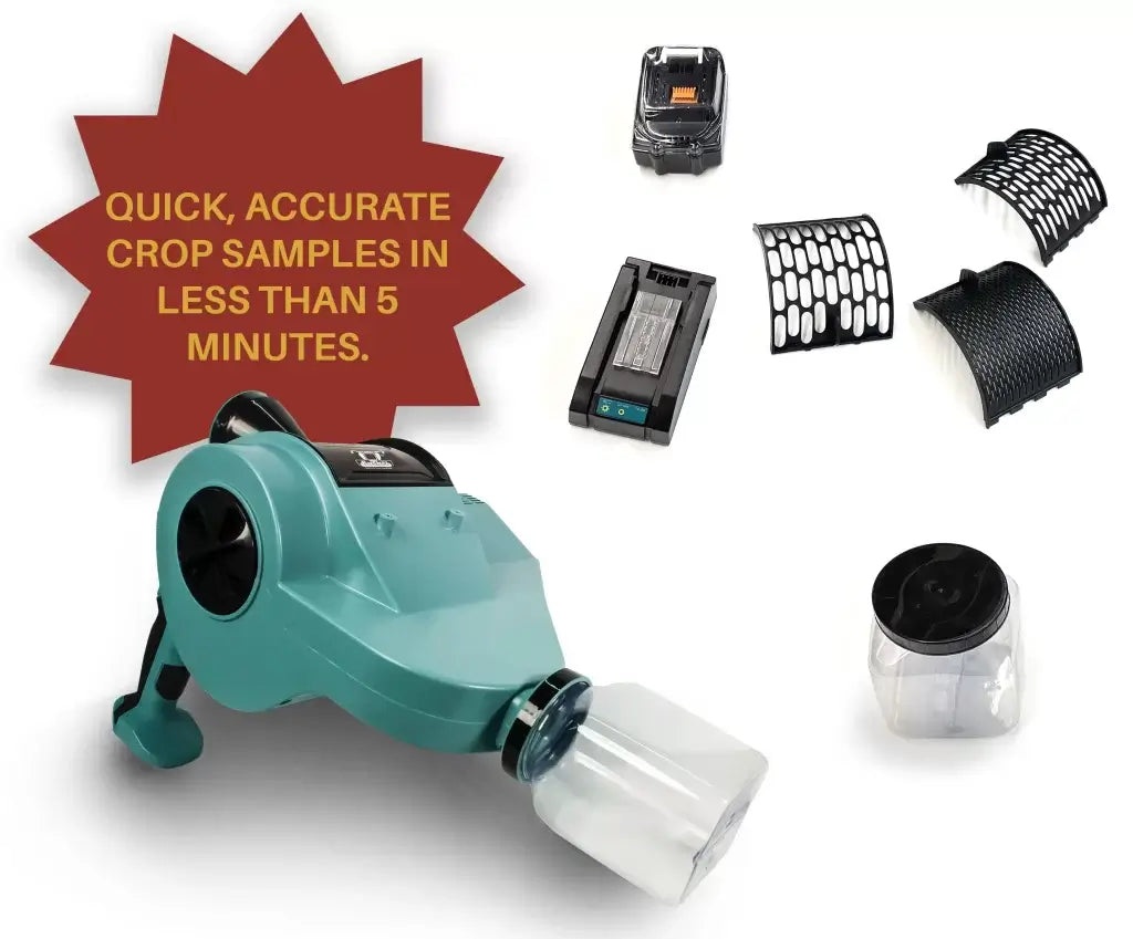 A portable electric device for taking samples of wheat, barley, canola, sorghum, oats, soya, peas, field beans, and flax.